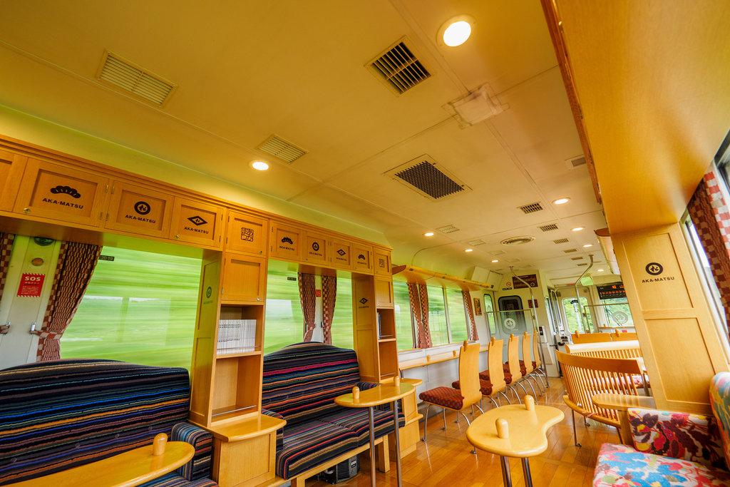 観光列車「あかまつ」をハピネスツアーが1車両貸切り。リッチな旅の始まりです。車窓からゆったりと景観を楽しめるよう、ソファ席、カウンター席など、さまざまなタイプの座席があり、ゆったり流れる丹後の景色をご堪能いただけます。