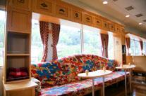 車窓からゆったりと景観を楽しめるよう、ソファ席、カウンター席など、さまざまなタイプの座席やショーケース、サービスカウンターなどを配置。 工業デザイナー水戸岡鋭治氏が、天橋立に代表される日本海の白砂青松を象徴する「松」をテーマにデザインを手がけています。