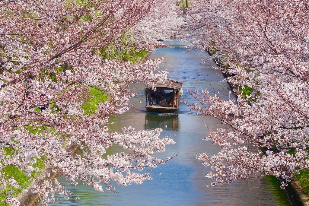 宇治川派流と濠川をゆったりと下る屋形船の十石舟。桜並木や酒蔵など歴史的な風情をのんびり楽しむことができる。途中、三栖閘門で下船し、資料館を見学。