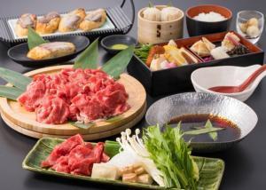 昼食は渡月橋を一望のレストランで「京野菜と特盛牛すき焼膳」をご賞味!