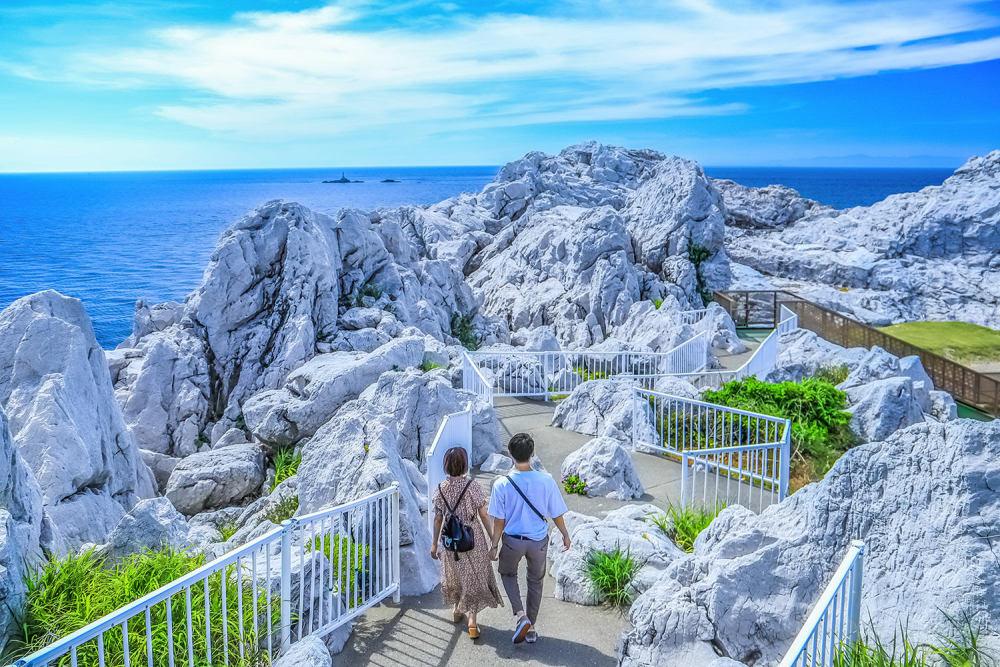 「日本の渚百選」にも選定されている白崎海岸は、その名の通り、岬が白い石灰岩で囲まれた県立自然公園。2億5000万年前にできたという荒々しい奇岩や怪石がダイナミックな風景を作り出し、見る者を悠久の大自然へと誘ってくれる。