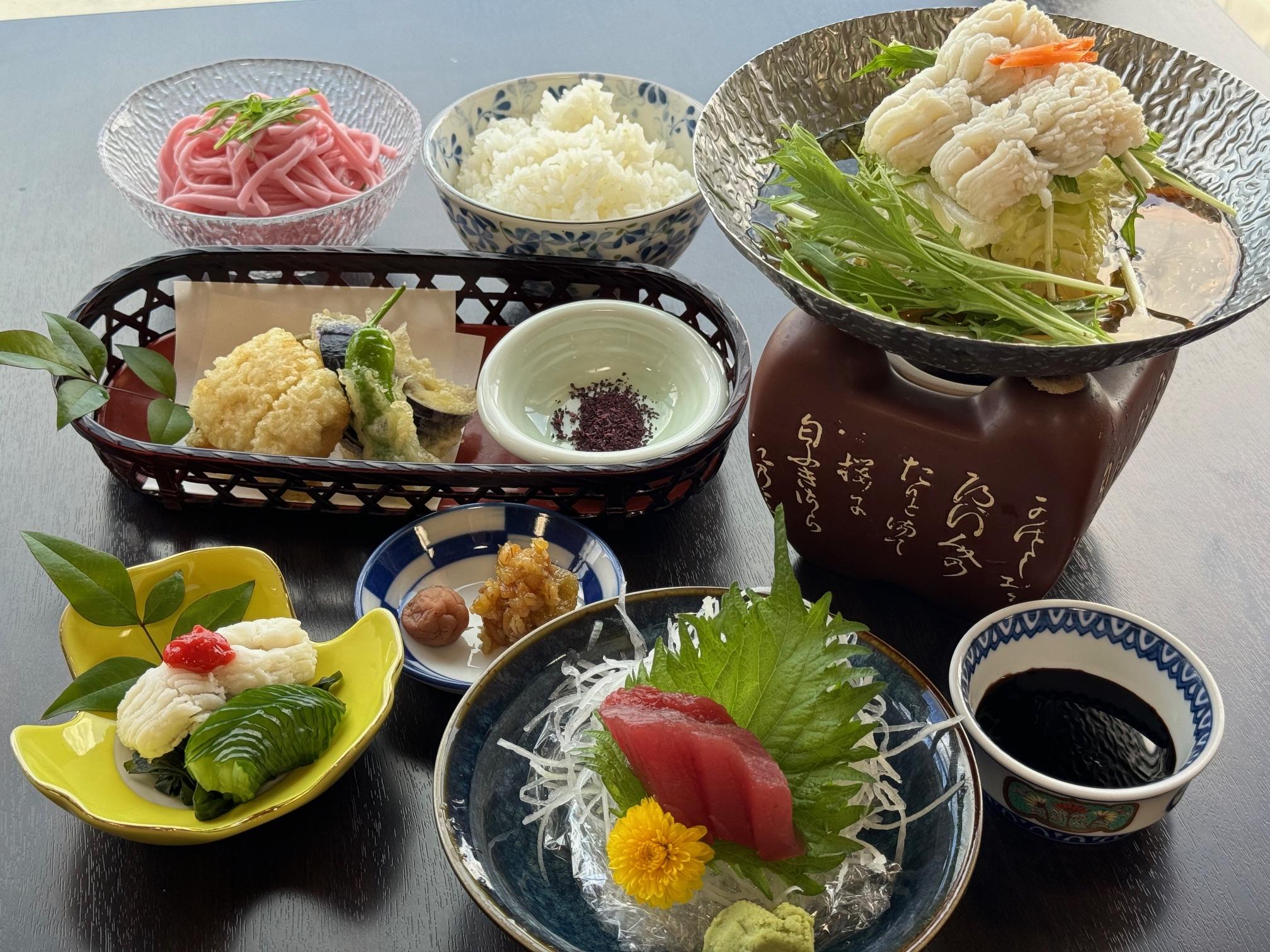鱧鍋、鱧落とし、鱧天ぷら、鮪造り、冷製梅うどん、金山寺味噌、ごはん