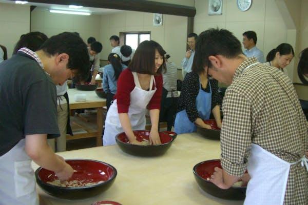 出石そばのそば打ち体験。2人で協力しながら仕上げましょう。