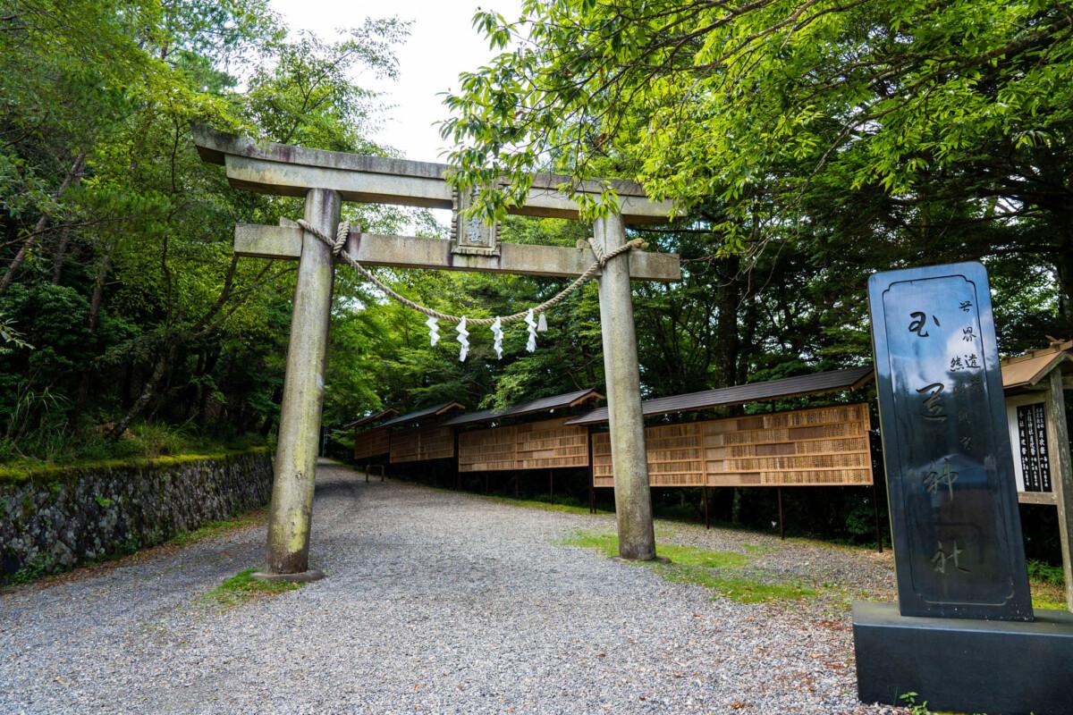 標高1076mの玉置山山頂近く鎮座し、熊野三山の奥の宮と称される古社。世界遺産に指定された大峯奥駈道の道上にあり修験道の行場としても栄えた。境内は樹齢3000年といわれる神代杉を始め、天然記念物に指定されている杉の巨樹群に包まれ、春にはシャクナゲが一円に開花する。社務所内では狩野派の筆による極彩色の杉戸・襖絵が拝観出来る。社務所は重要文化財に指定されている。
