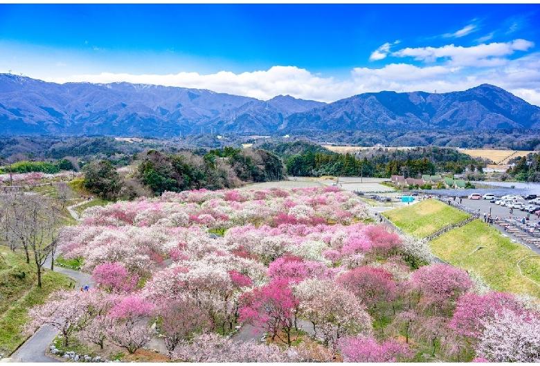 東海エリア最大級の梅林公園。38万平方mの敷地に、多品種の梅が咲く。鈴鹿山脈を一望できる高地にあり、その眺望と梅とのコントラストが美しい。