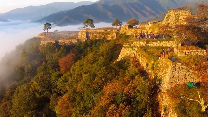 天守台は標高353.7mの山頂に築かれ、規模は南北400m、東西100mに及ぶ。完存する石垣遺構としては全国屈指。自然石を巧みに配置した近江穴太衆による石垣は、400年を経た今なお当時の威容を誇る。日本城郭協会「日本100名城」にも選ばれている。秋から冬にかけての晴れた早朝には、雲海に包まれた竹田城跡を望むことも。その姿は天空に浮かぶ城を思わせ、幻想的な風景がひろがる。