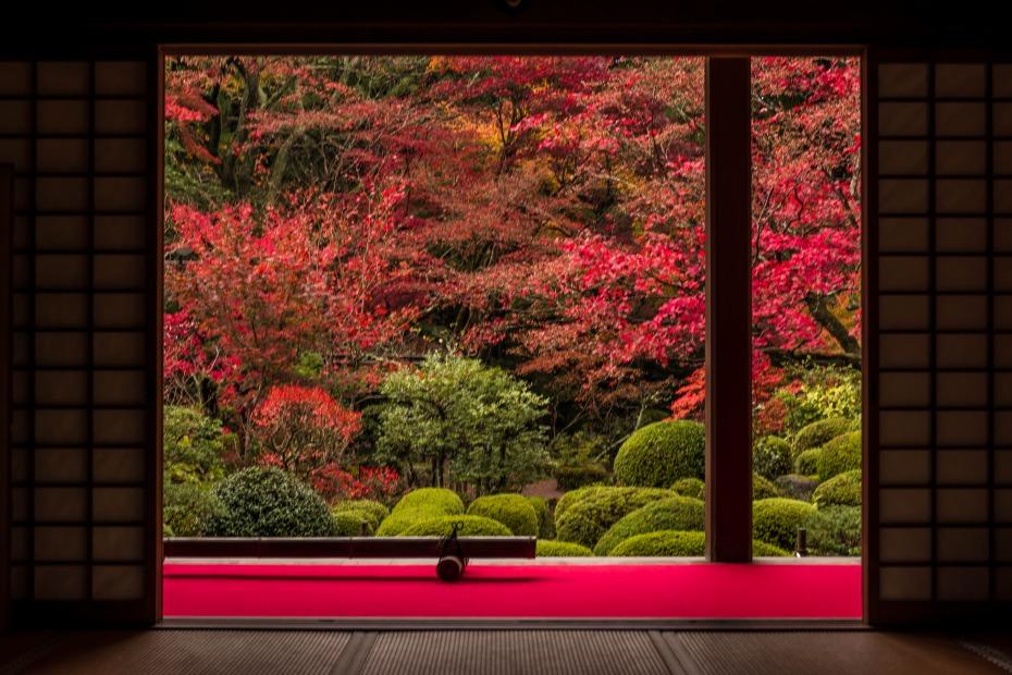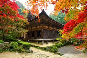 鈴鹿山脈西麓に点在する「湖東三山」はどの寺も紅葉が美しいが、特に金剛輪寺のヤマモミジやトウカエデの紅葉はその鮮烈な色合いから「血染めの紅葉」の名で知られている。1200年以上前に聖武天皇の勅願で行基が開山。境内には国宝の本堂、国指定重要文化財の二天門と三重塔、国指定名勝庭園がある。