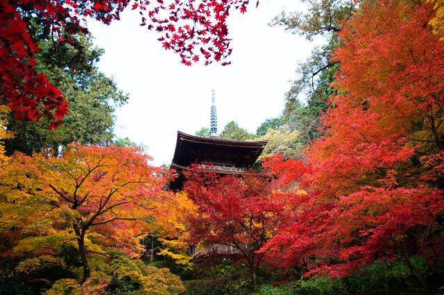 鈴鹿山脈西麓に点在する「湖東三山」はどの寺も紅葉が美しいが、特に金剛輪寺のヤマモミジやトウカエデの紅葉はその鮮烈な色合いから「血染めの紅葉」の名で知られている。1200年以上前に聖武天皇の勅願で行基が開山。境内には国宝の本堂、国指定重要文化財の二天門と三重塔、国指定名勝庭園がある。