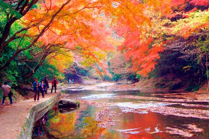 孝子伝説で有名な養老の滝を中心に、広大な園内が紅葉に染まる。霊亀3年(717)、元正天皇がその水の清らかさに感動し、若返りの美泉とたたえ、年号を養老と改元したと伝えられる菊水泉[きくすいせん]は養老神社内にある。養老の滝もみじ祭りを実施中です。