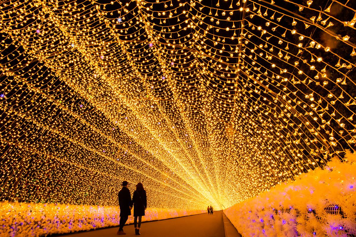 2004年から開催し、今年で22回目を迎えた「なばなの里イルミネーション」。2025-2026のテーマは「ジパング」。東方見聞録に記された黄金に輝く島国伝説や、浮世絵の世界観、四季折々の日本の原風景を躍動感あふれる幻想的な光と音でダイナミックに演出します。