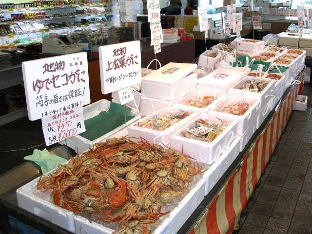 日本海目の前に位置し、漁港からあがりたての鮮魚を底値で売る。直営の食事処も安く、新鮮、ボリュームたっぷりで地元でも人気の店。冬の松葉カニを中心に、1年中地物が買え、味わえる。