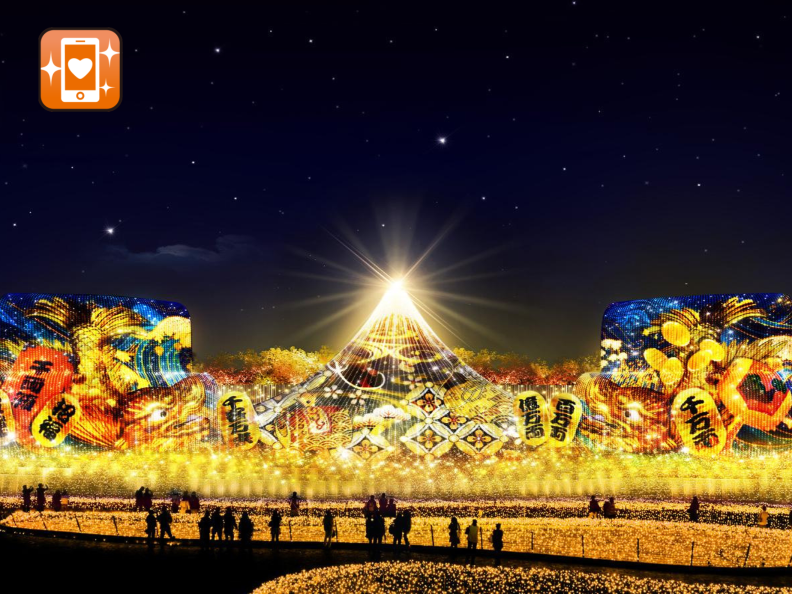 2004年から開催し、今年で22回目を迎えた「なばなの里イルミネーション」。2025-2026のテーマは「ジパング」。東方見聞録に記された黄金に輝く島国伝説や、浮世絵の世界観、四季折々の日本の原風景を躍動感あふれる幻想的な光と音でダイナミックに演出します。