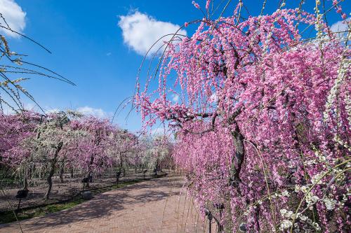 約3000坪の梅苑には約330本のしだれ梅があります。中には樹齢120年、140年を越える梅の古木もあり、その美しさはとくに目を惹きます。梅の香りがいっぱいの梅苑で、艶やかな薄紅色の花を付けるしだれ梅をご体感ください。実際に目の前でご覧いただくと期待をはるかに超える素敵な景色が広がります。梅の香気は夜に強く漂うそうです。夜の観梅もぜひお楽しみください。