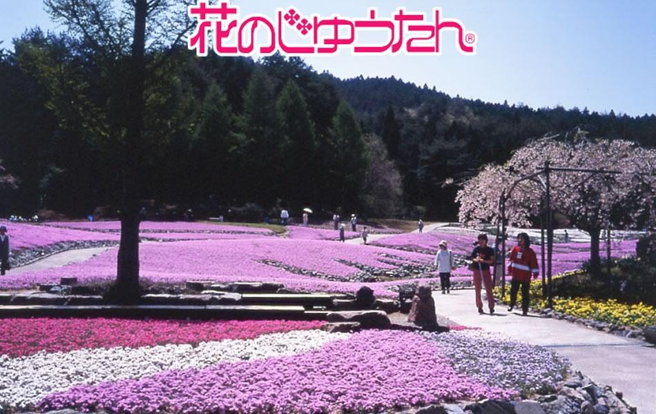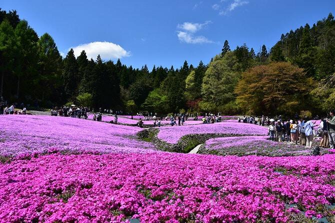 全国でも数少ない芝桜専門庭園。シーズン中は、緩やかな丘に約1億輪もの芝桜が咲き誇り、まるで花の絨毯を広げたような圧巻の風景が見られる。