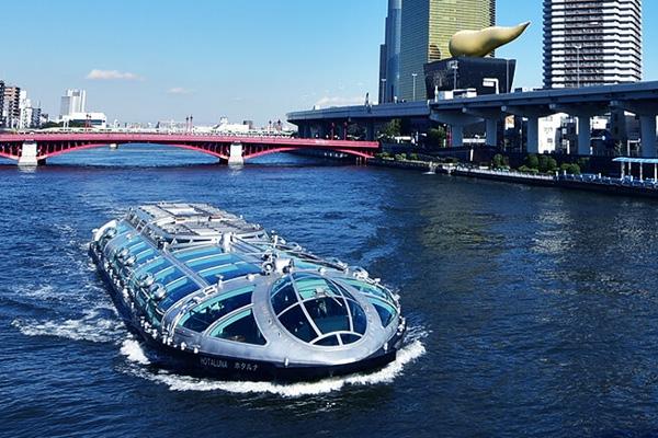 そして一つ目のクルーズ・隅田川クルーズ。宇宙船のような『ホタルナ』で快適クルーズをお楽しみ下さい。