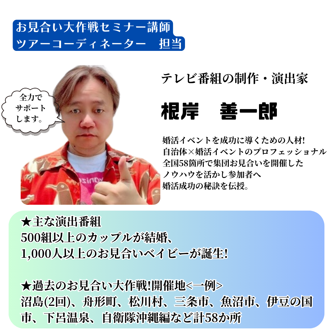 ●過去500組以上のカップルを成婚に導き1,000人以上のお見合いベイビーを誕生させた自治体婚活イベントのプロ「根岸 善一郎」が同行します♪