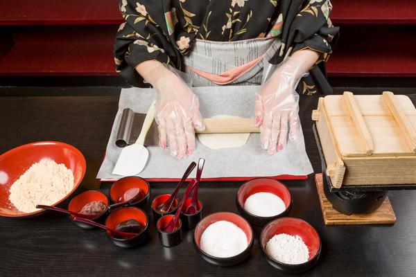 京都を代表する京菓子“生八つ橋”。つぶあん・抹茶・焼き栗の生八つ橋3種類にチャレンジ。出来上がりはおみやげに。