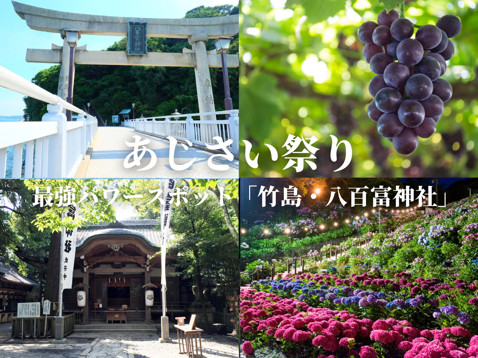 【ハピ旅クラブ・開運縁結び旅】最強のパワースポット「竹島」&蒲郡名物!しらす釜飯ランチとぶどう狩り&食べ放題と5万株が咲き乱れる形原あじさい祭りライトアップ