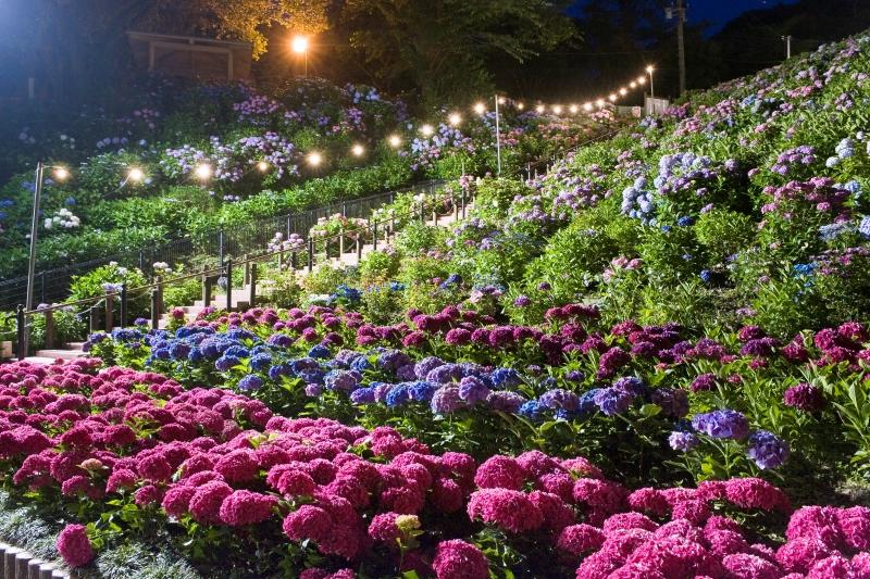 植裁された5万株100種類以上のアジサイが咲き乱れる「形原温泉あじさい祭り」。青や紫、ピンク、白など、カラフルな花々が夜空に映えて美しい光景が広がります♪