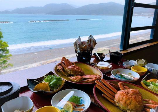 昼食は日本海・若狭の海辺のレストランで日本海・若狭の海辺のレストランでずわいカニ1枚付かに会席コースをお召し上がりいただきます。食後は天然の足湯もお楽しみ下さい。