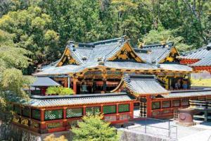 境内は、高さ6.5mの石鳥居から始まり、1159段の階段を登って本殿まで歩きます。途中には、朱塗りの「楼門」があり、平和の象徴とされる4体の獏(ばく)の彫刻が見どころ。本殿である「御社殿」は厳かでありつつも豪華絢爛な佇まいであり、国宝に指定されるほど貴重です。