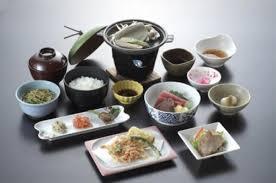 前菜3種、桜えびと野菜の天ぷら、刺身盛り合わせ、陶板焼き(黒はんぺん・桜えび餃子等)、茶そば、味噌汁、ご飯、漬物、安倍川餅