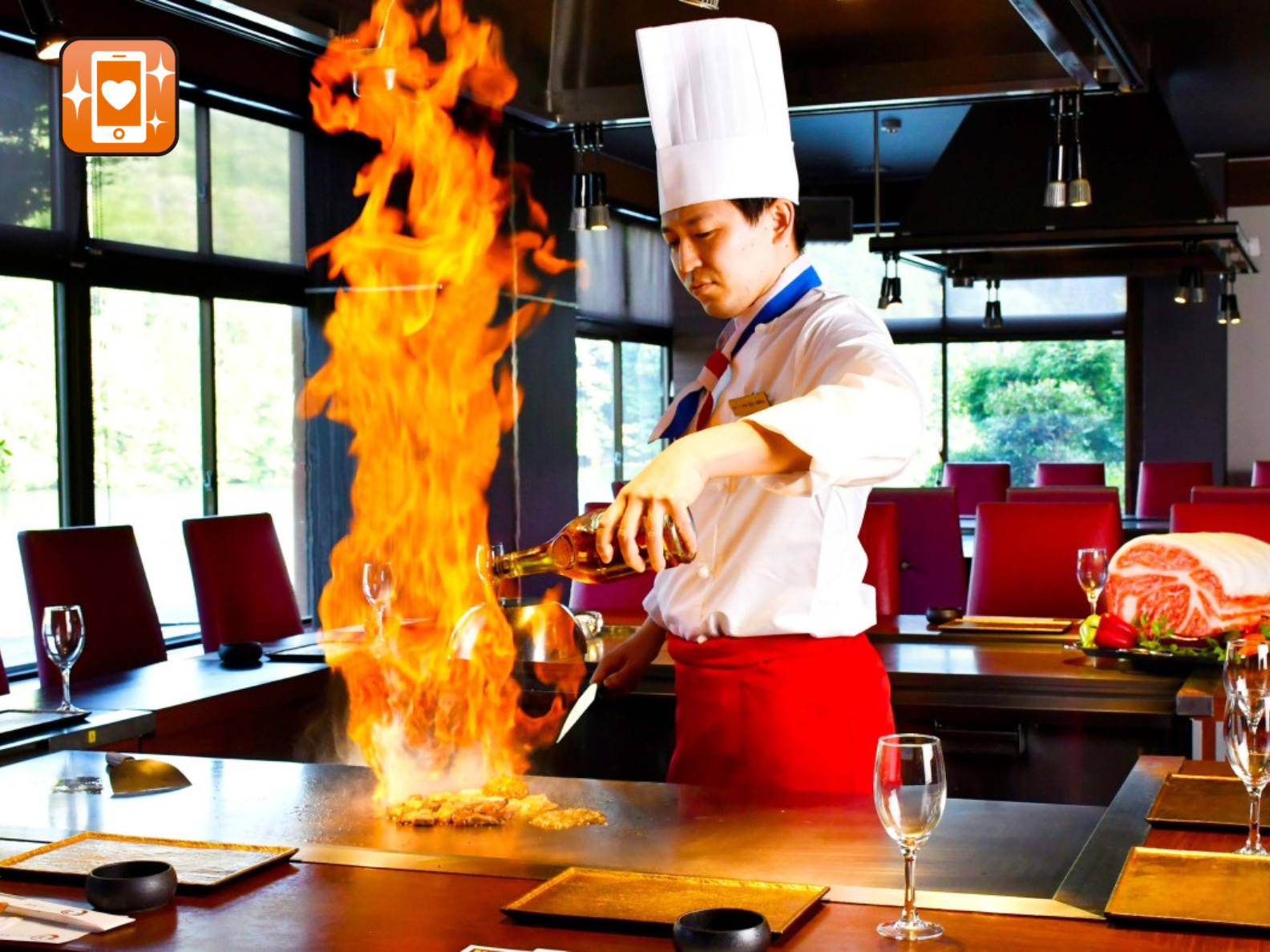 【アプリ対象ツアー】昼食はシェフがお客様の目の前で焼き上げる近江牛ステーキ鉄板焼コース料理をお楽しみ下さい