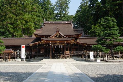 延命長寿・縁結びの神として古くから全国的な信仰を集め、豊臣秀吉の厚い信仰もありました。祭神として天照大神(あまてらすのおおみかみ)の両親の伊邪那岐命(いざなぎのみこと)と伊邪那美命(いざなみのみこと)を祀っている旧官弊大社です。「お多賀さん」の名で親しまれ、駅前の大鳥居から神社までの参道の両わきにみやげ店などが並びます。