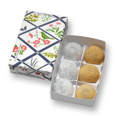 一つは、大粒の黒大豆とつぶ餡を餅生地で包み、もう一つは、こし餡と大豆を包んだ餅生地にきな粉をまぶしました。お餅と豆の食感をお楽しみください。