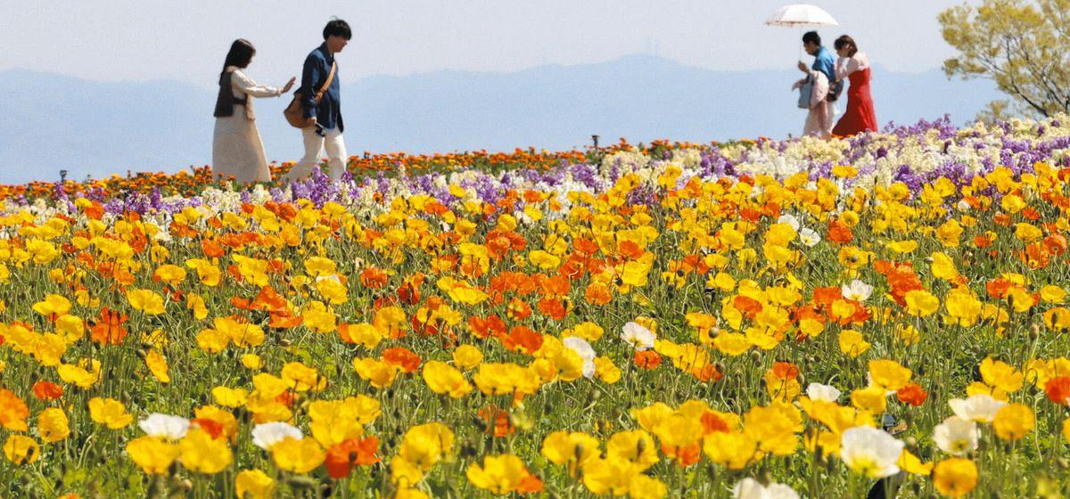 続いては観光農園花ひろばへ。一年を通じて温暖な南知多ならではの気候を生かした観光農園です。広大な敷地で季節ごとに彩る花畑を散策できます。この時期はポピーやネモフィラが見頃です。