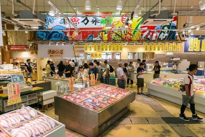巨大な鮮魚市場には愛知県随一の漁獲量を誇る「豊浜漁港」「片名漁港」から数分の好立地を活かし、セリから直送された、獲れたて新鮮な魚貝類がお値打ちに並びます。