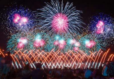 華麗な花火と迫力ある音楽の融合により、スターマインを中心に約10,000発の花火が夜空を彩ります。