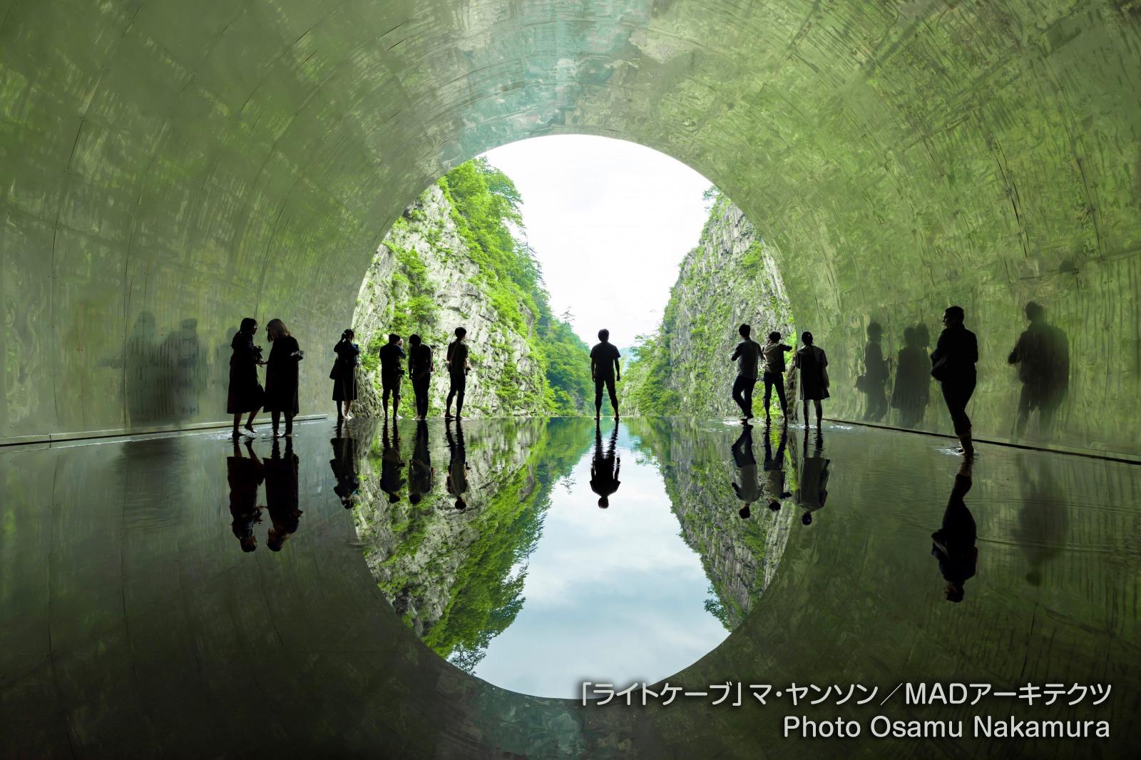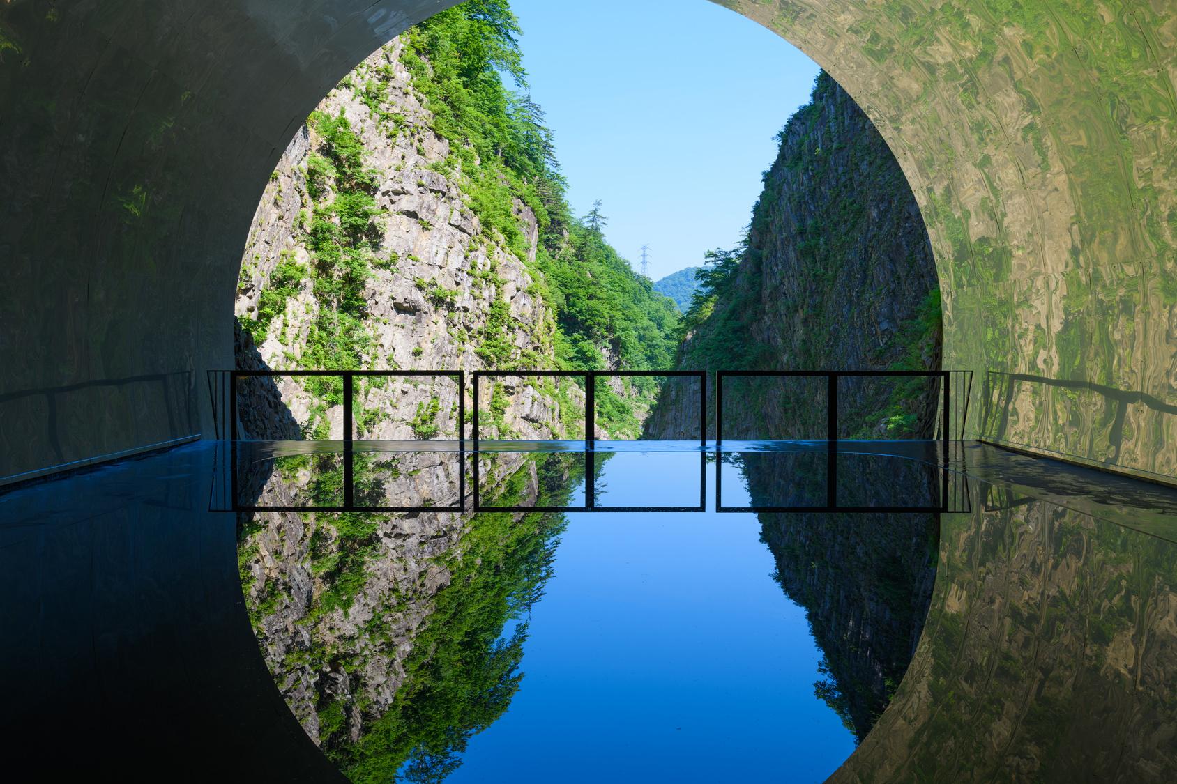 トンネル一番奥のパノラマステーションに構えるのが、建築家マ・ヤンソン率いるマッド・アーキテクツが仕掛けるインスタレーション<ライトケーブ>。天井にはステンレス板が貼られ、床に張られた渓谷の水が、清津峡の自然美をまるで鏡のように反射し、丸いトンネルを作り上げています。
