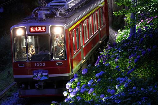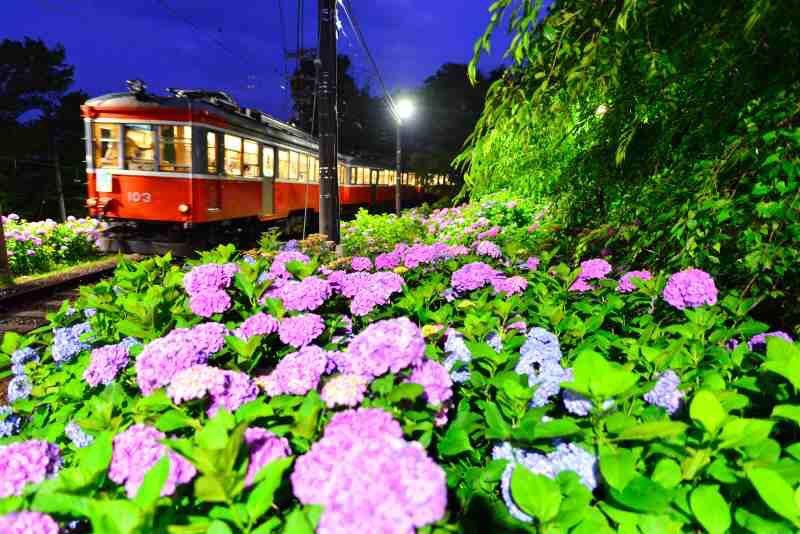 初夏の箱根を満喫できる“箱根あじさい電車”とライトアップに照らされる幻想的なあじさいをお楽しみいただきます。