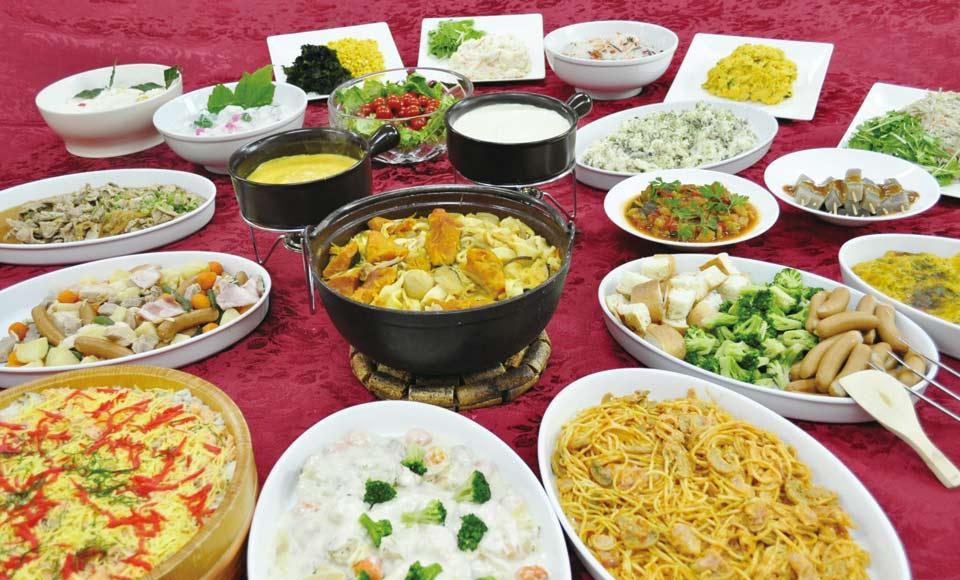 夕食は河口湖畔のハイジズフラワーガーデンでプレミアムバイキング。チーズフォンデュをはじめとしたスイス料理と甲州郷土料理が食べ放題。