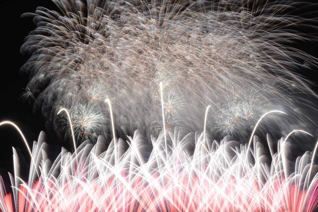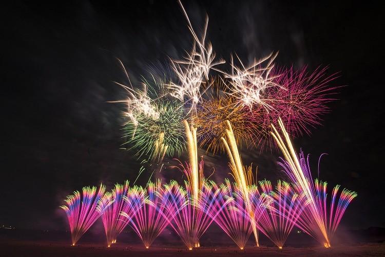 音楽とのシンクロや観客席の間近で打上げられるスターマイン、目の前で上がる尺玉など迫力満点。今年度は、茨城が誇る花火師である山崎煙火製造所・野村花火工業に、昨年の土浦全国花火競技大会で内閣総理大臣賞を獲得した紅屋青木煙火店を加えた3大花火師による夢の競演により、関東最大級の2万2800発の花火が夜空を彩る。
