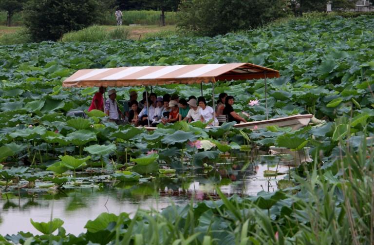まずは花ハス祭りが開催中の館林市つつじが岡公園へ。花ハスクルーズの体験です。