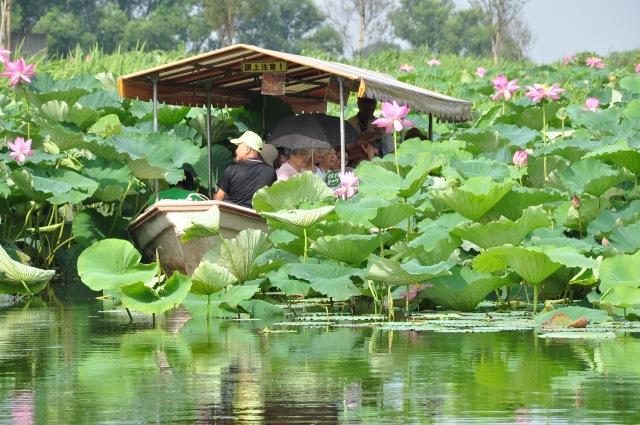 蓮の間に造られた細い隙間を滑るように進んでいきます。蓮の葉は大きく、船に当たってばちばちと大きな音を立てます。船の屋根より高く伸びている葉もあり、まるで亜熱帯のジャングルに迷い込んだ気分。予想外の迫力に、思わず歓声が上がります。