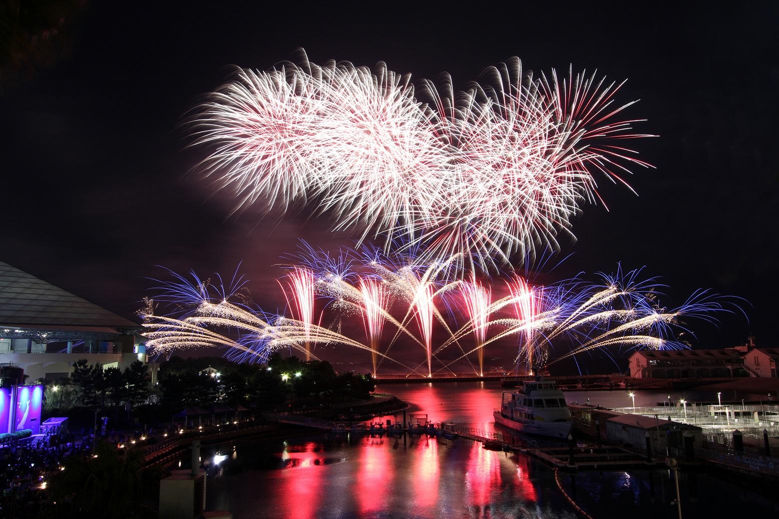 花火と音楽をコンピュータ制御によりシンクロさせたオリジナル花火ショー「花火シンフォニア」。音楽と花火の幻想的な世界に吸い込まれて、時間の感覚を忘れそう。防波堤から打ち上げるので水面に映る花火もキレイ。カップルにも人気のショーですよ。
