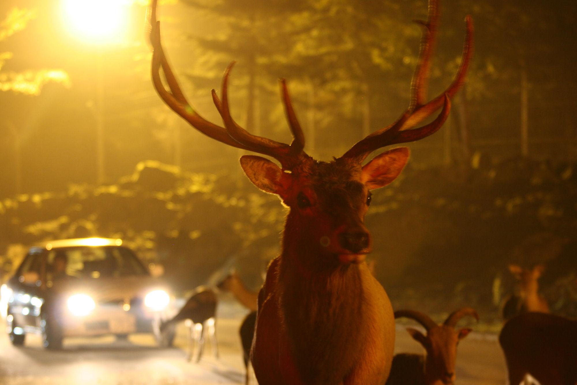 ライトアップされた幻想的な雰囲気の中、マイカーやナイト動物バスに乗ってサファリゾーンの野生動物を見学!