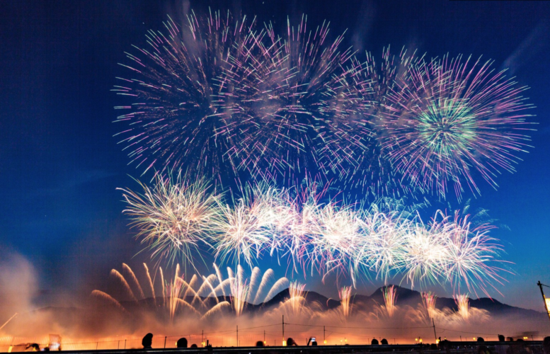日光連山をバックに、大小約5,000発のスターマインが打ち上がり、川辺に映りこむ様はとっても幻想的。目玉は、夜空を華麗に彩るスターマインとSL汽車のコラボ。