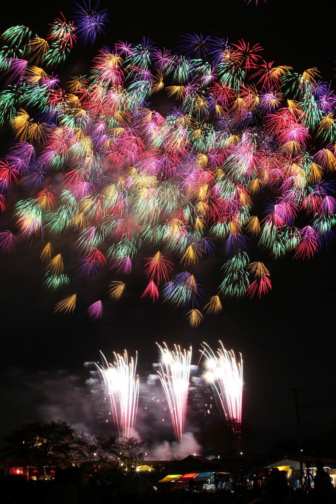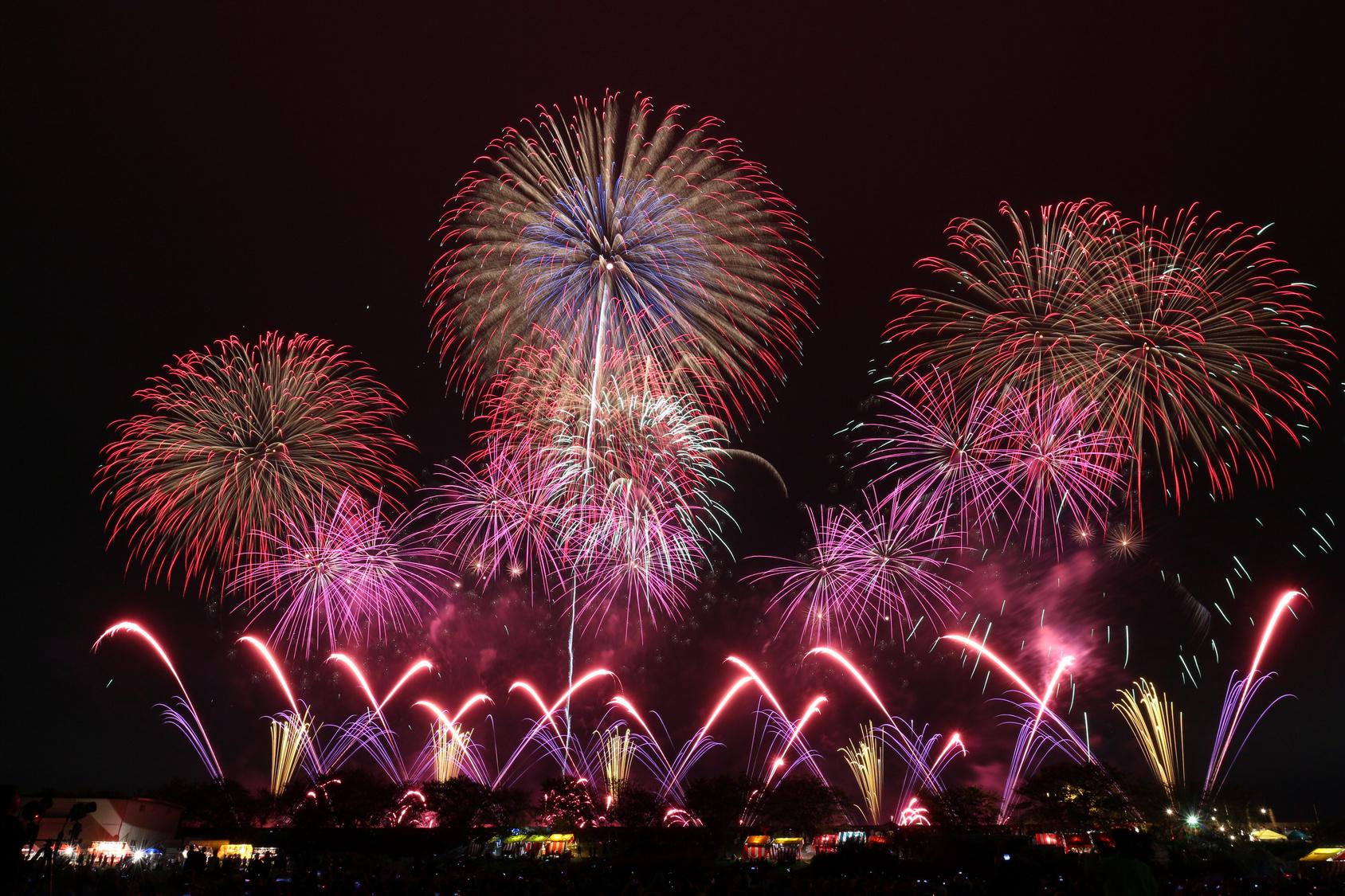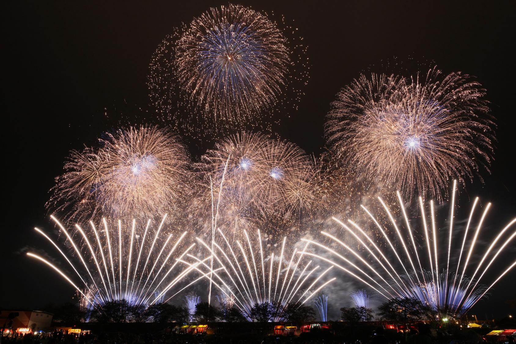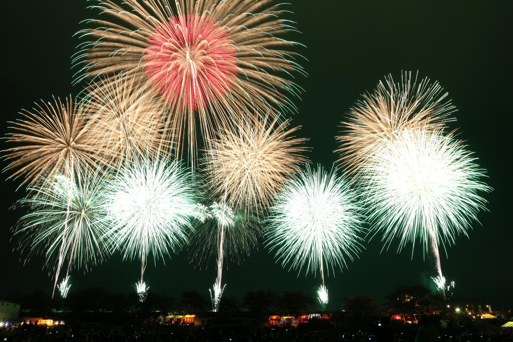 日本三大花火の一つともいわれる、1925年(大正14年)から続く茨城県土浦市の伝統ある花火競技大会。全国の煙火業者約60社が技を競い合う、国内屈指の大会だ。競技は、速射連発のスターマイン、発色や煙火の開き方を審査する10号玉の打ち上げ、型物や新しい技術を披露する創造花火の3部門構成で行われる。3部門それぞれの優勝者の中から、煙火技術の向上に貢献し、観客を魅了した最も優秀な煙火業者には内閣総理大臣賞が授与される。今年の煙火のトレンドも分かる大きな大会だ。