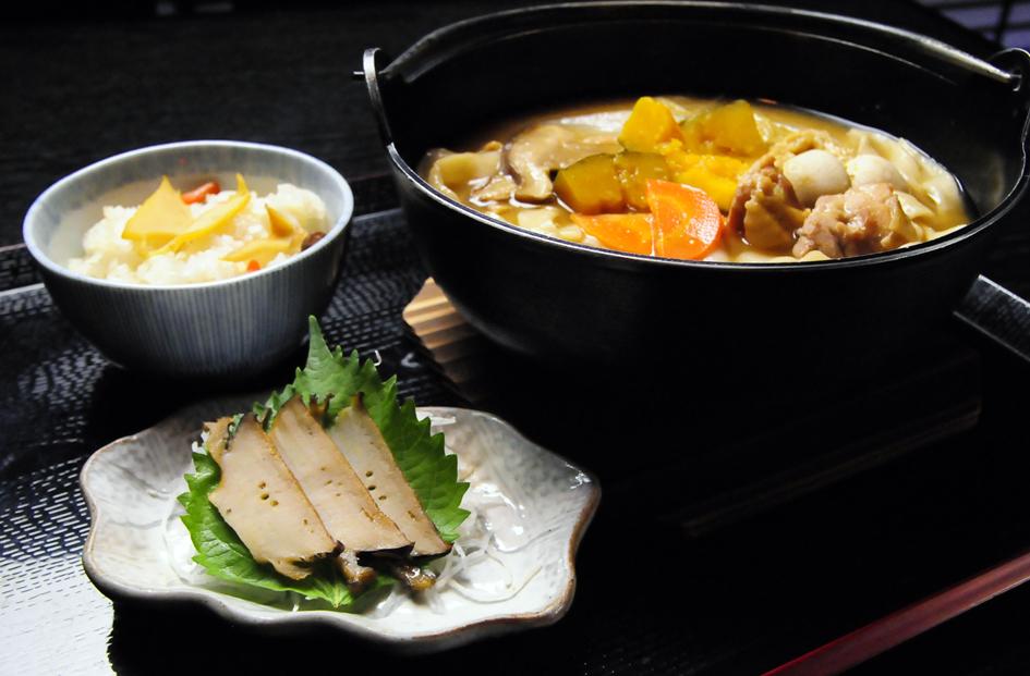 ●ランチは昼食は甲州・郷土料理の店「菓々茶寮」で名物のあわびの煮貝に煮貝ごはん・ほうとう鍋と郷土料理のミニバイキングをお召しあがりいただきます。