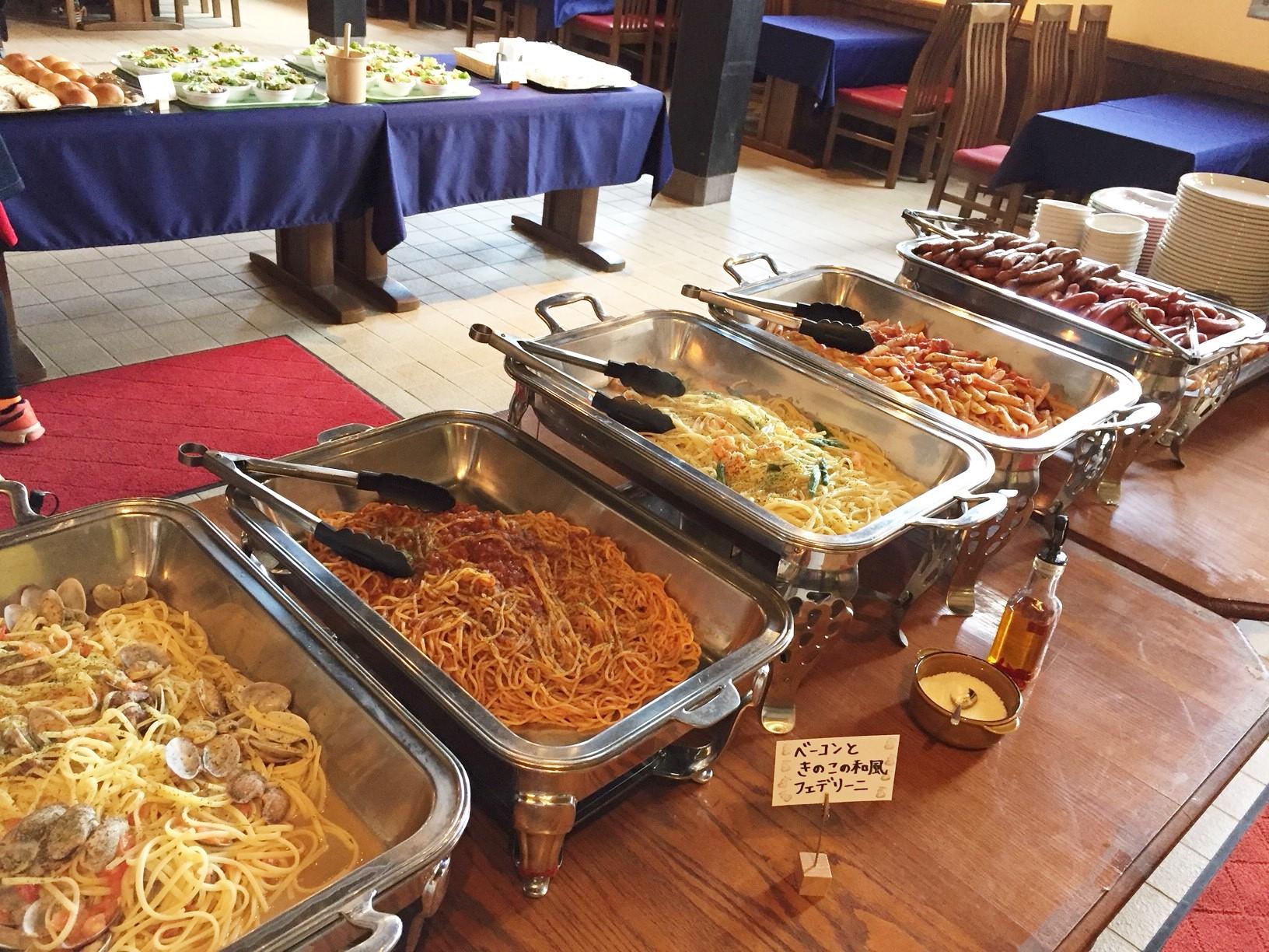 昼食は、シェフ自慢の5種類のパスタビュッフェと園内工房で製造・加工された、自家製ハムや乳製品、パンを美味しくお召し上がりいただきます。