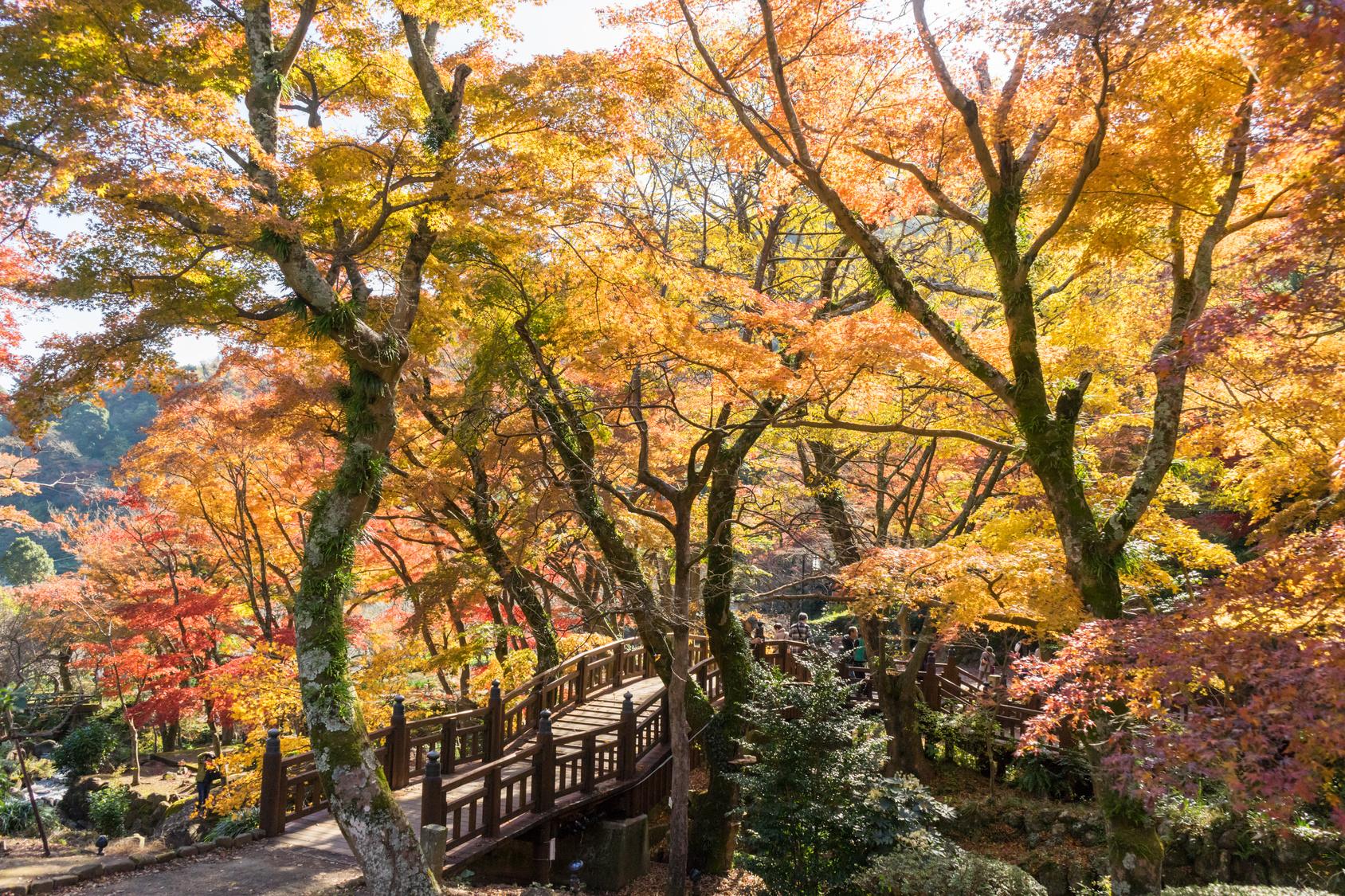 園内にはカエデ類が380本あり、温暖な気候のせいか、毎年11月下旬から12月にかけて色づくため 「日本で最も遅い紅葉」とも言われます。