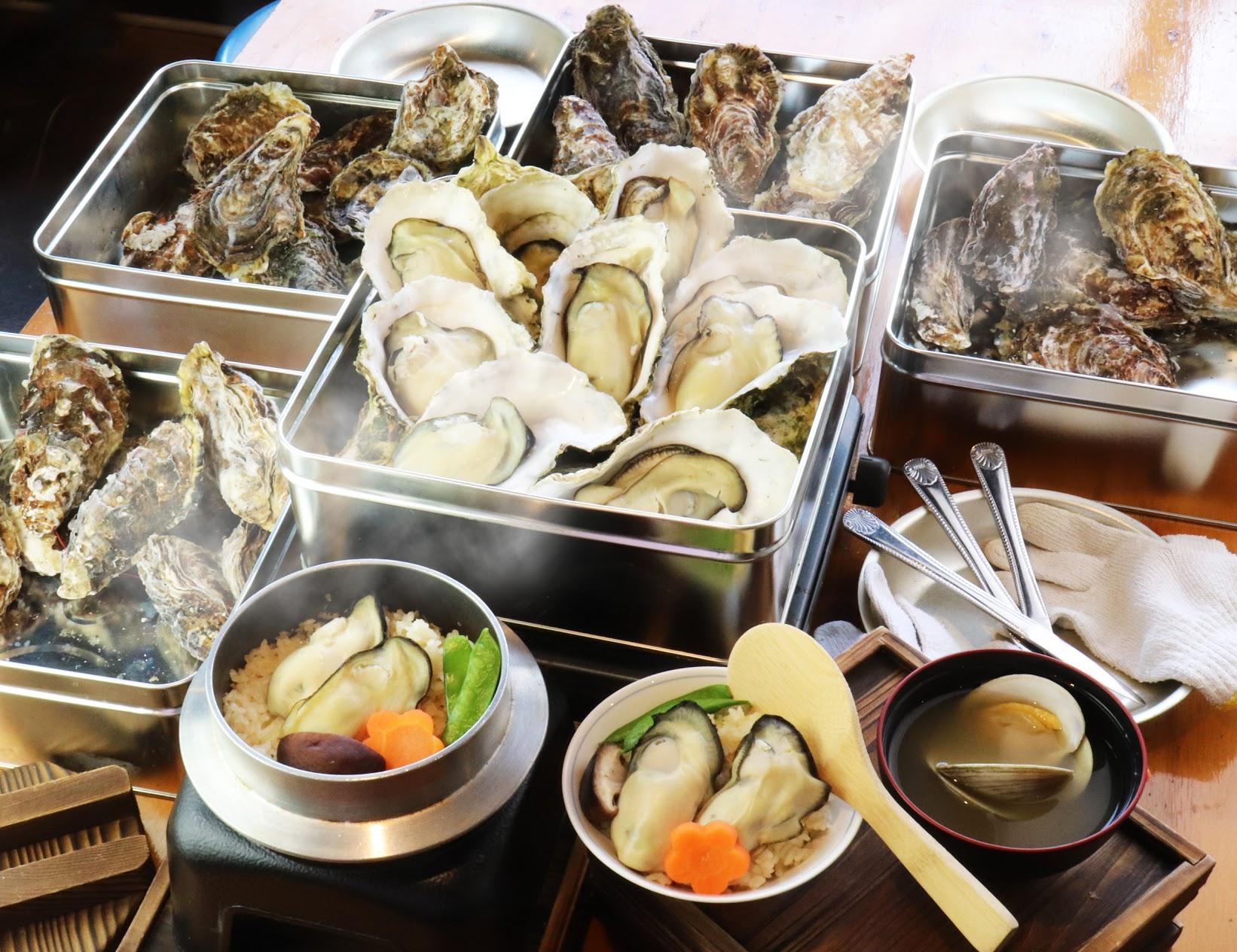 ランチはカキ小屋名物!牡蠣のガンガン焼きを《食べ放題》でお召し上がりいただきます。「がんがん焼き」とは、カキを缶の中に豪快に入れ、酒蒸しにする漁師ならではの調理法です。 まさに、海の漢達が編み出した究極の調理法! 海水と 酒で蒸し上げたその味は絶品!牡蠣めしも一緒にどうぞ!!