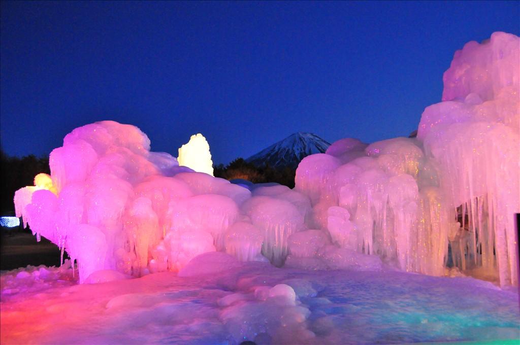 続いては、ライトアップされた西湖樹氷まつりの見学。凛とした空気の中、氷の祭典の鑑賞タイムです。