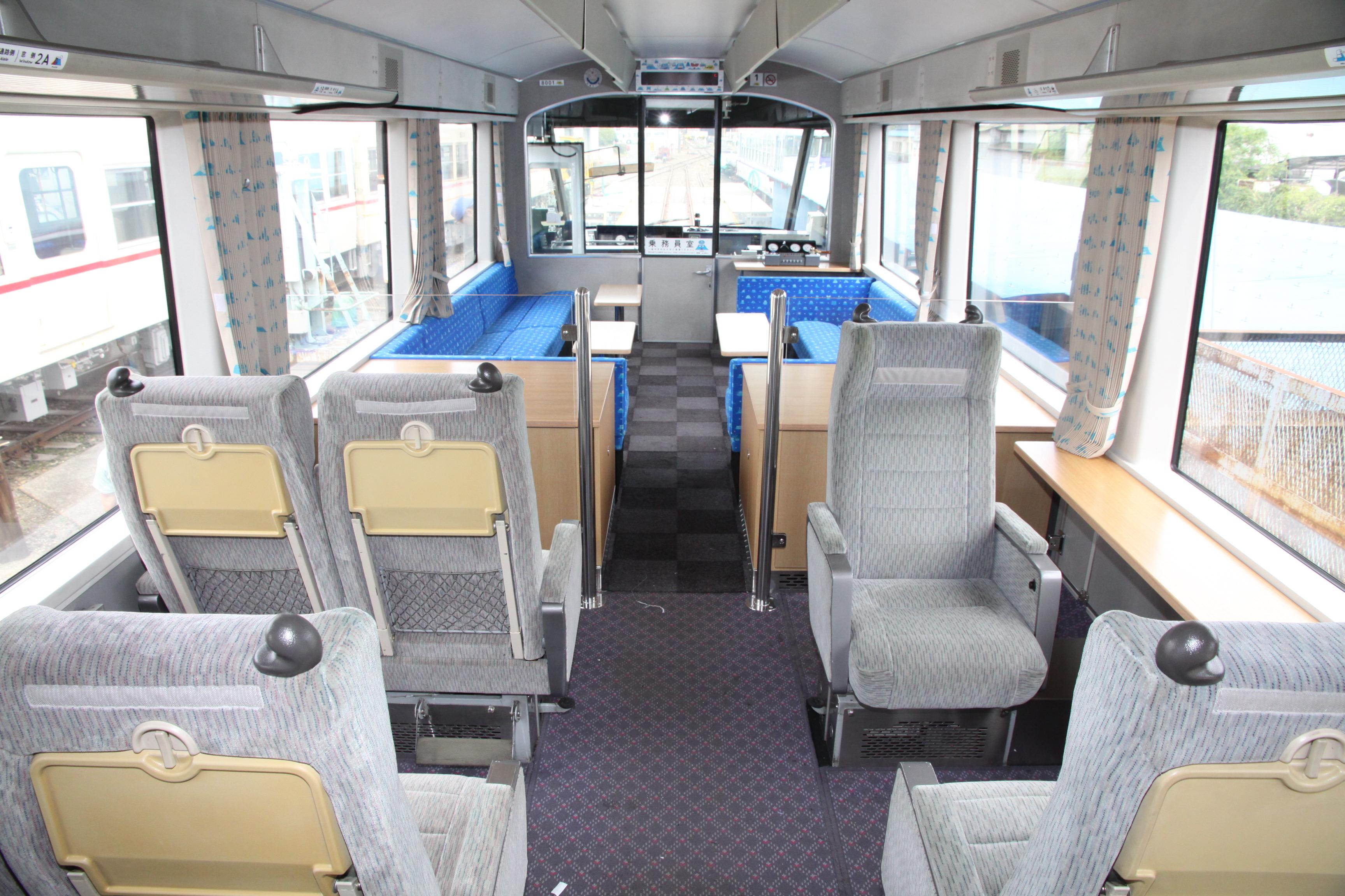 座席定員制の1号車は展望車両で、運転席の後ろはガラス張りなので運手操作が見られるだけでなく、運転手の視線から、臨場感あふれる富士山が味わえる。