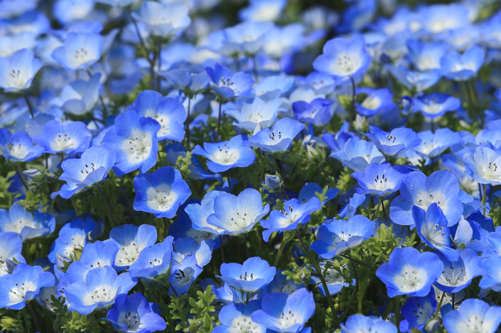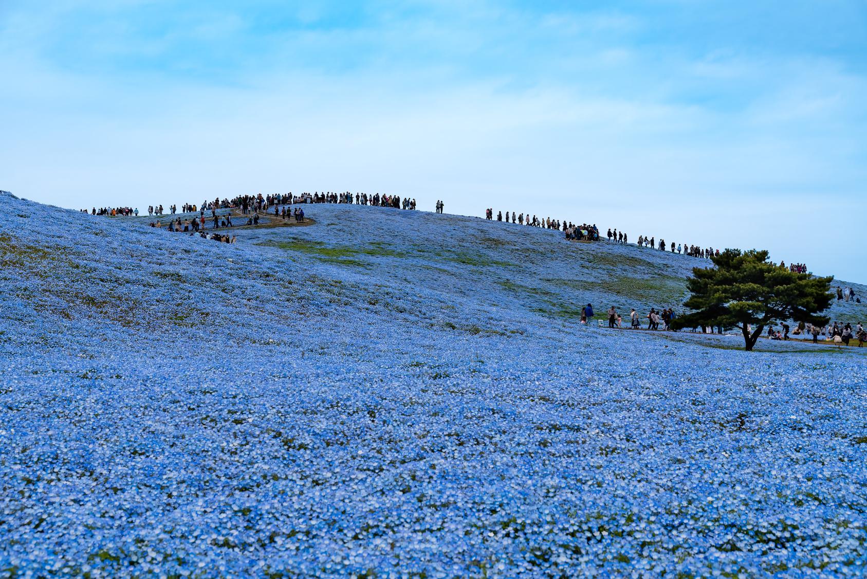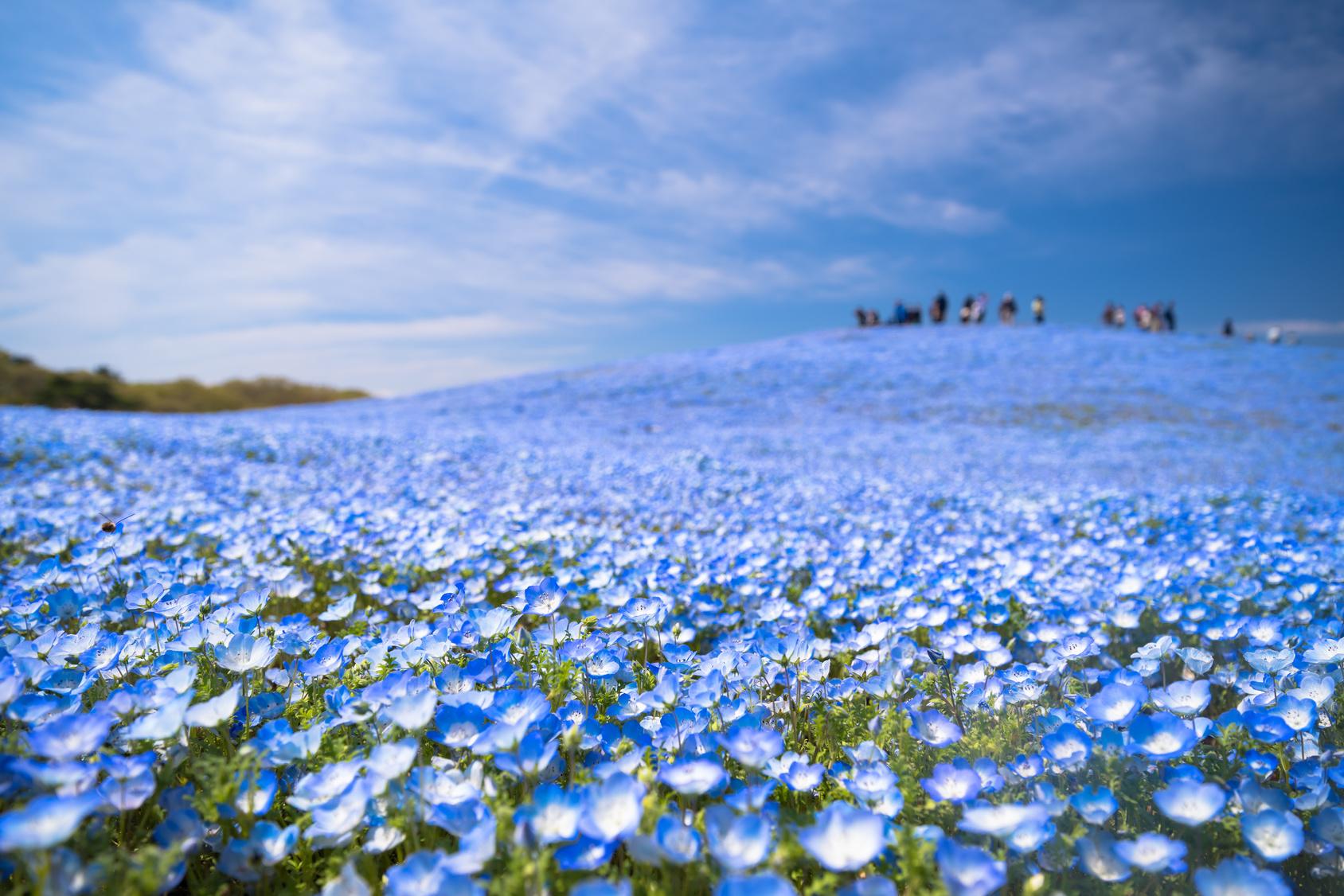 ●幻想的なネモフィラハーモニー。約3.5haもの広大な“みはらしの丘”一面に、450万本のネモフィラの花が広がります!