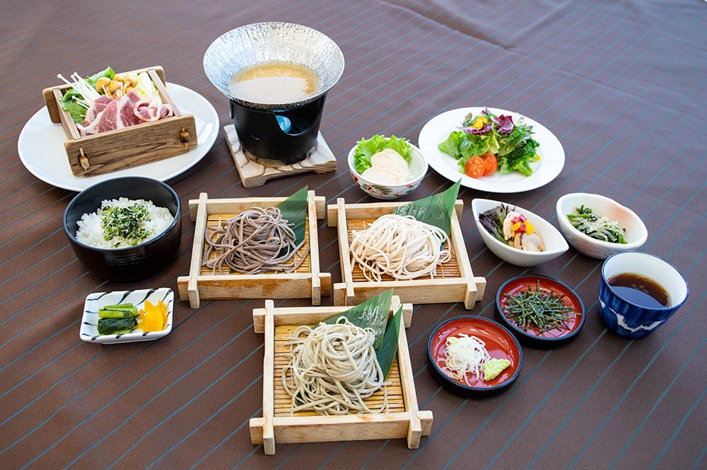 昼食は信州みそ仕立ての豚しゃぶや信州そば等、地元の食材を使用した和食膳をお召し上がりいただきます。